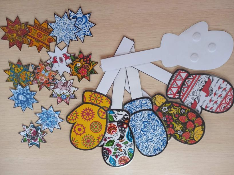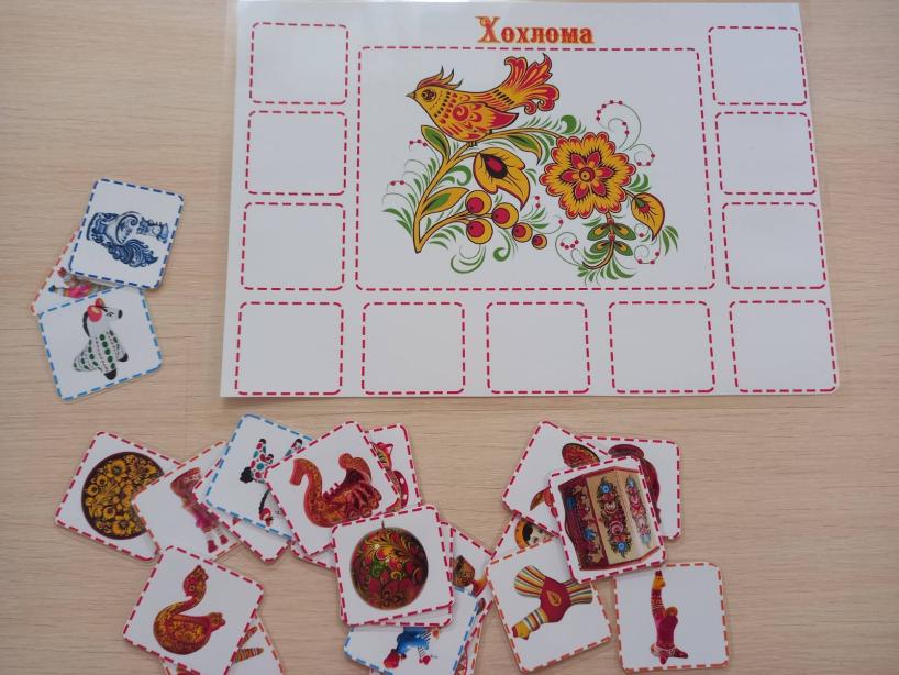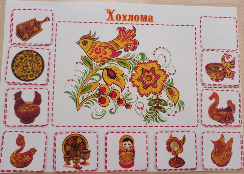 Перед началом игры педагог рассматривает вместе с детьми элементы росписи предметов двух народных промыслов Постепенно количество рассматриваемых элементов росписи народных промыслов увеличивается.