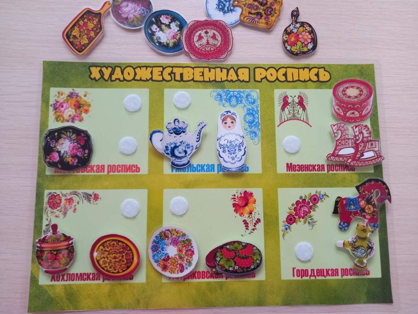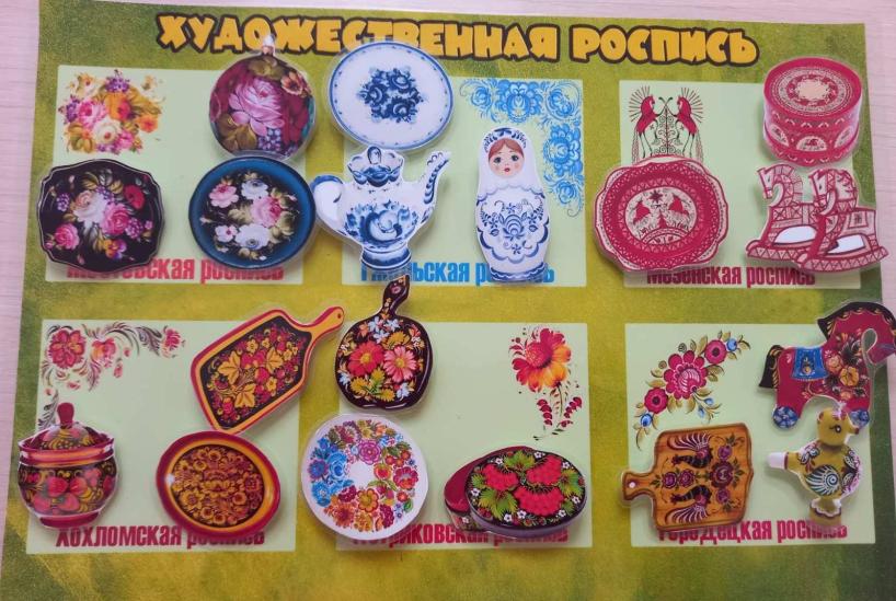 Цель игры: продолжить знакомство с разными видами народного декоративно-прикладного искусства, обогащать зрительные впечатления, формировать интерес и эстетический вкус у дошкольников.